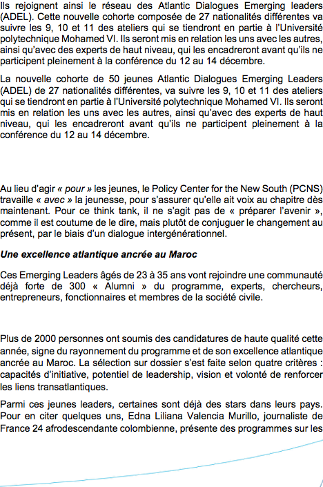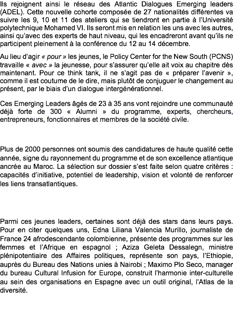 Ils rejoignent ainsi le réseau des Atlantic Dialogues Emerging leaders (ADEL). Cette nouvelle cohorte composée de 27 nationalités différentes va suivre les 9, 10 et 11 des ateliers qui se tiendront en partie à l’Université polytechnique Mohamed VI. Ils seront mis en relation les uns avec les autres, ainsi qu’avec des experts de haut niveau, qui les encadreront avant qu’ils ne participent pleinement à la conférence du 12 au 14 décembre. Au lieu d’agir « pour » les jeunes, le Policy Center for the New South (PCNS) travaille « avec » la jeunesse, pour s’assurer qu’elle ait voix au chapitre dès maintenant. Pour ce think tank, il ne s’agit pas de «préparer l’avenir », comme il est coutume de le dire, mais plutôt de conjuguer le changement au présent, par le biais d’un dialogue intergénérationnel. Ces Emerging Leaders âgés de 23 à 35 ans vont rejoindre une communauté déjà forte de 300 « Alumni » du programme, experts, chercheurs, entrepreneurs, fonctionnaires et membres de la société civile.