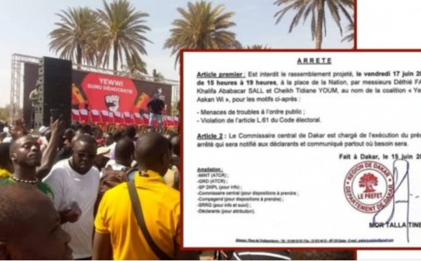 La manifestation de Yewwi Askanwi n’aura pas lieu ! C’est du moins ce qu’a décidé le préfet de Dakar. Il a interdit ce rassemblement qui était prévu ce vendredi 17 juin à la place la Nation. Dans son...